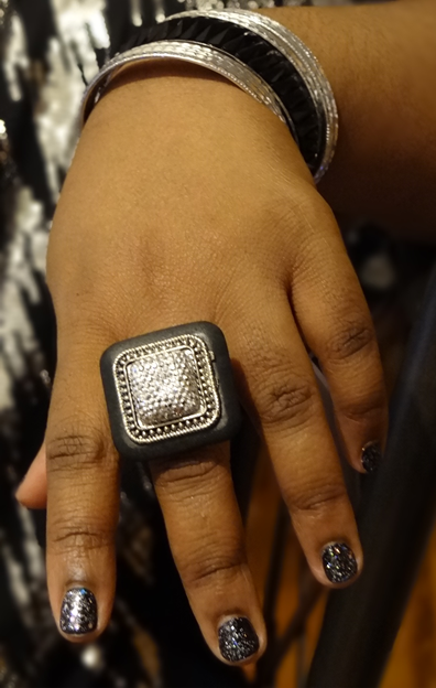 Saturday night I was in the Bronx at an All Black Affair at Paradise Theater. The music was great and there was a live performance by an upcoming rapper named Fred the Godson. Always ready to get glam, I polished my nails with a combo of two brands of nail polish. The base coat was Black Tie (095) by Confetti and a top coat of Starry Silver Glitter (105) by New York Color. I put on a few sparkly bracelets; a pair of sparkly earrings; a square black and silver ring that, beautifully, complimented my black top with silver sequence. It was so on that evening!