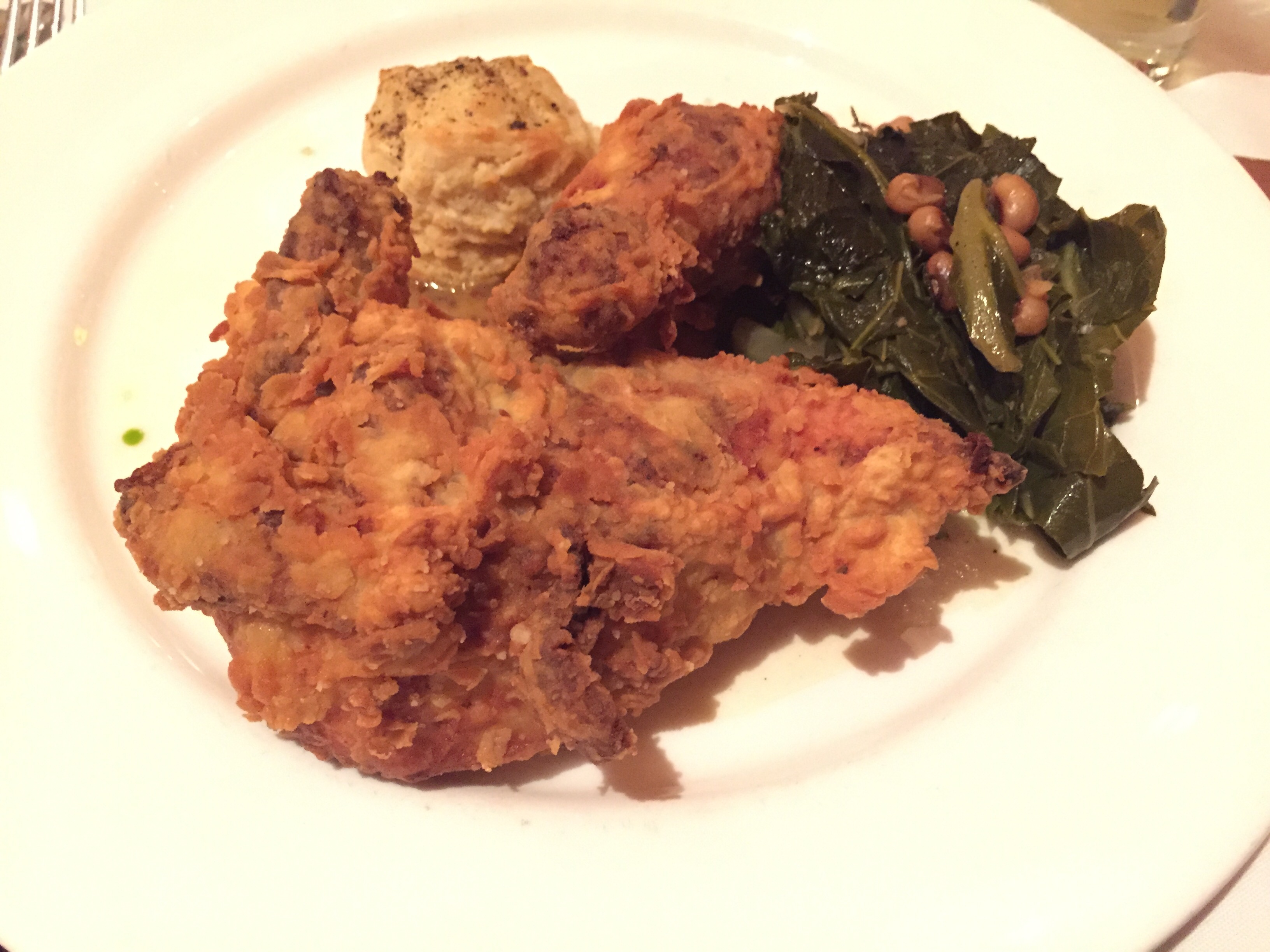 I ordered their fried chicken which came with collard greens, black eye peas and a salt and pepper biscuit. The menu says the fried chicken is a “secret recipe,” I’m totally fine with them keeping the recipe a secret! What’s no secret is the food has little flavor and the $35.00 fried chicken was underdone. I had better fried chicken for less than $3.00 at the local Kennedy’s near 176th Street on the Grand Concourse in the Bronx. The greens had too much vinegar and the biscuit was bland at Bar Americain. None of it was worth the money. You are paying for the location and the name when you eat there.
