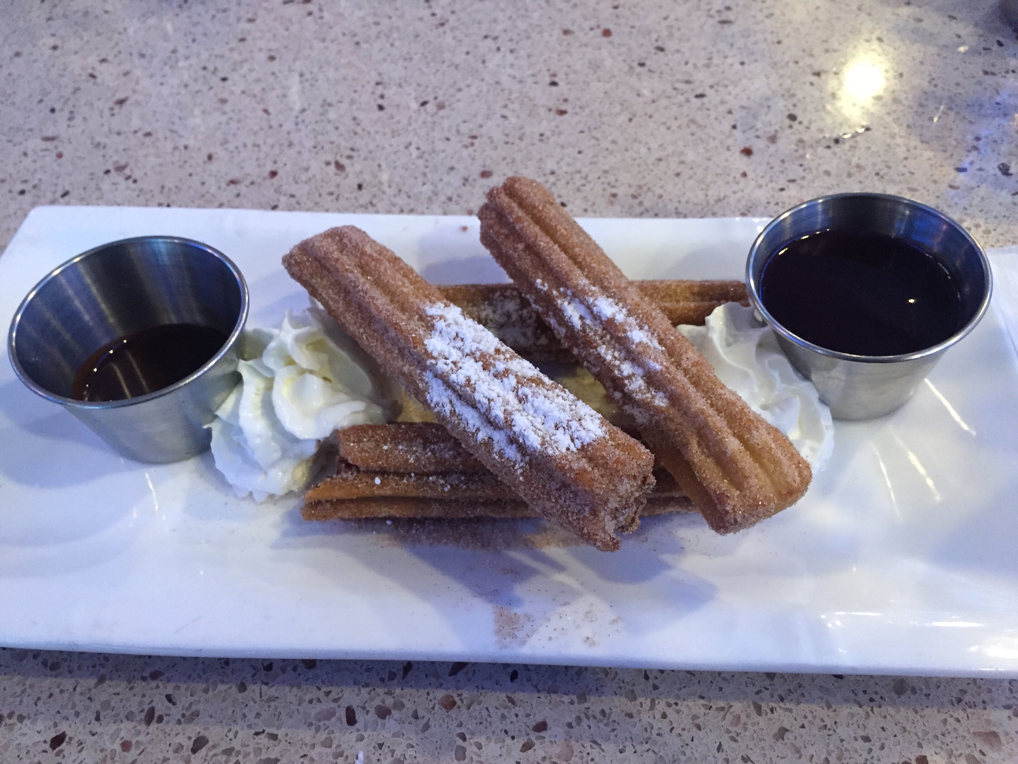 Although we were stuffed, we still made room for Churros! The Churros came with chocolate dipping sauce and raspberry dipping sauce. The flavor of the churros dipped in the raspberry sauce was out of this world! The outside of each Churro was crunchy, while the inside was warm and gooey. The Churros were heavily dusted with cinnamon and sugar, which only magnified the deliciousness of this Mexican treat.